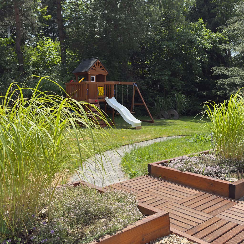Hřiště je zasazeno do bezpečného a přehledného prostoru, kde na své ratolesti uvidíte i z lavičky se šálkem kávy. Kolem voní tymián, levandule a v pozadí tiše šumí les.