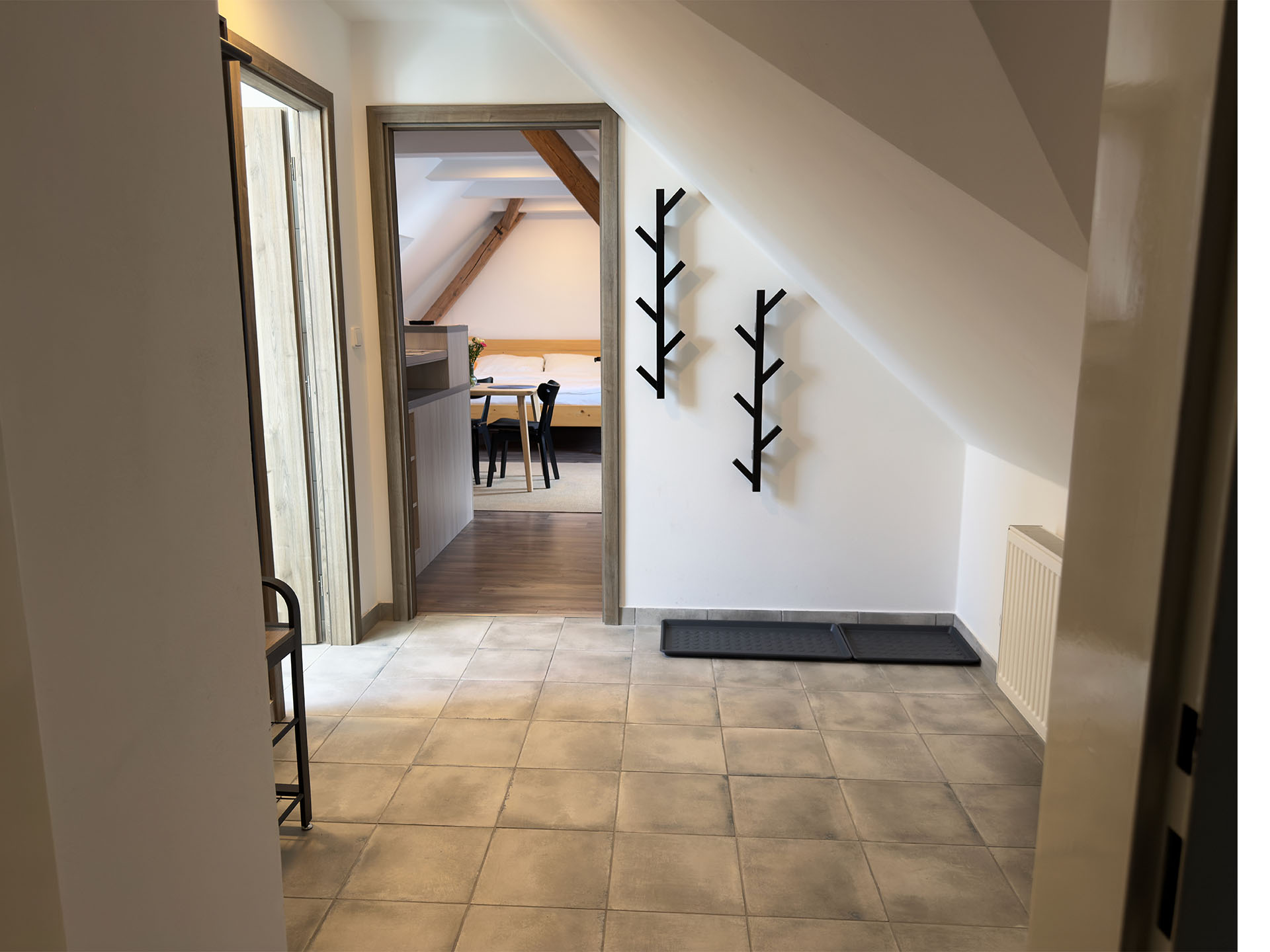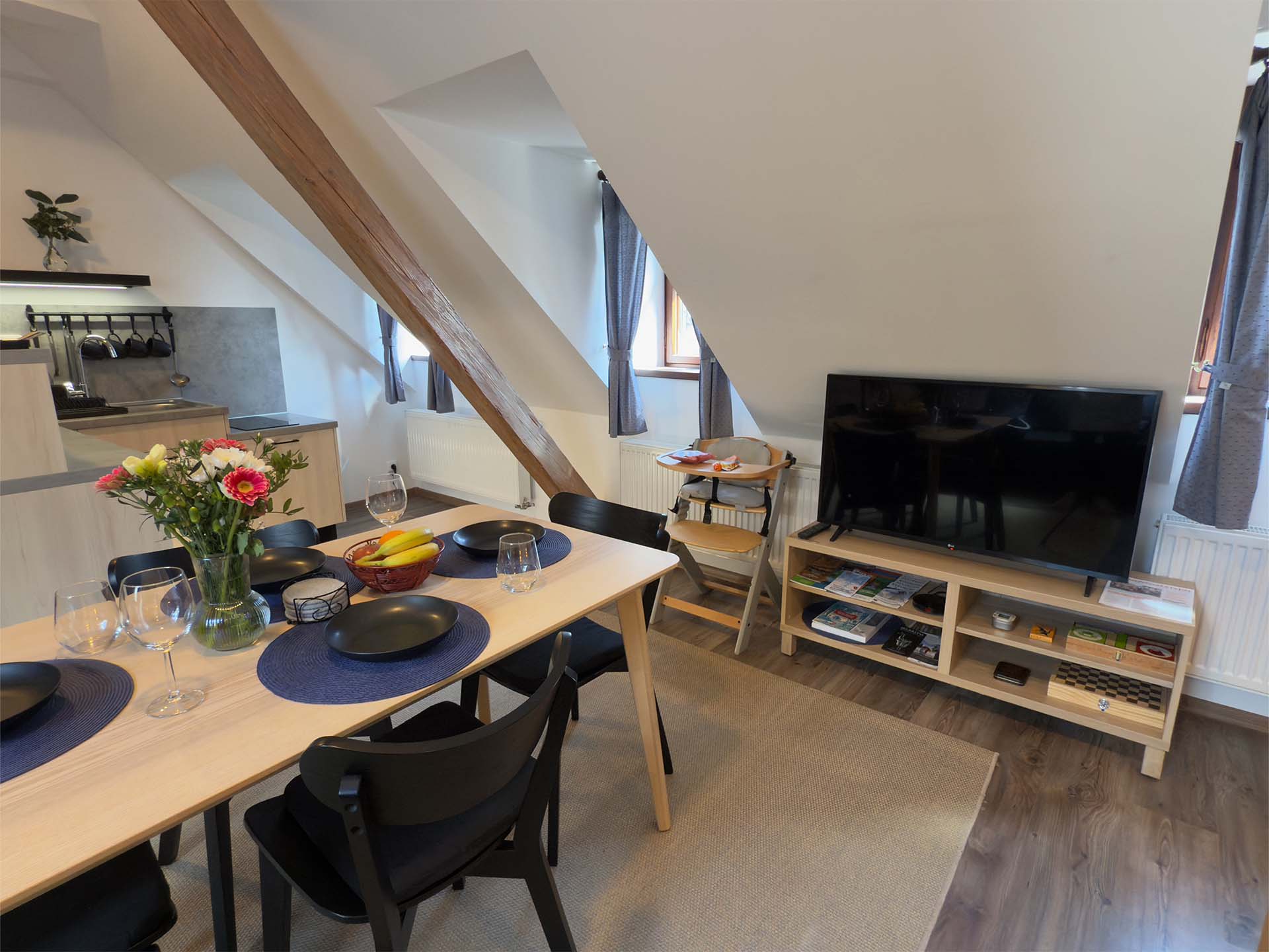 Nejprostornější studio apartmán v našem mlýně. Nabízí světlý pokoj s koupelnou (sprchový kout a toaleta), chodbou a plně vybaveným kuchyňským koutem. K dispozici je jídelní stůl, rozkládací pohovka, velká televize (42”) s Wi-Fi, a také společenské hry a karty. Atmosféru dotvářejí zrenovovaná dřevěná okna a trámy.