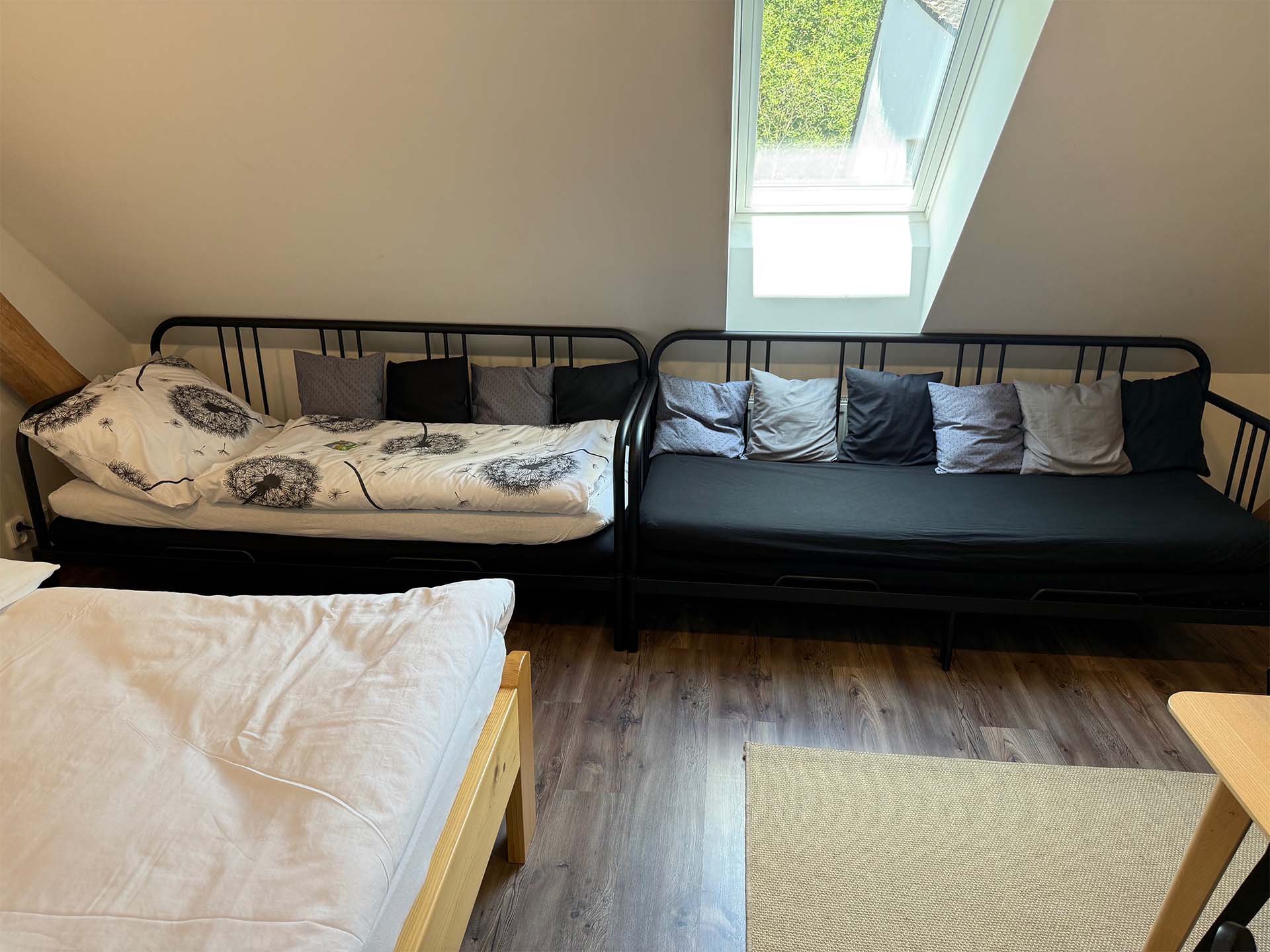 Spánek si užijete v manželské posteli z masivního dřeva s hypoalergenním povlečením z bio bavlny. Úložné prostory jsou samozřejmostí.