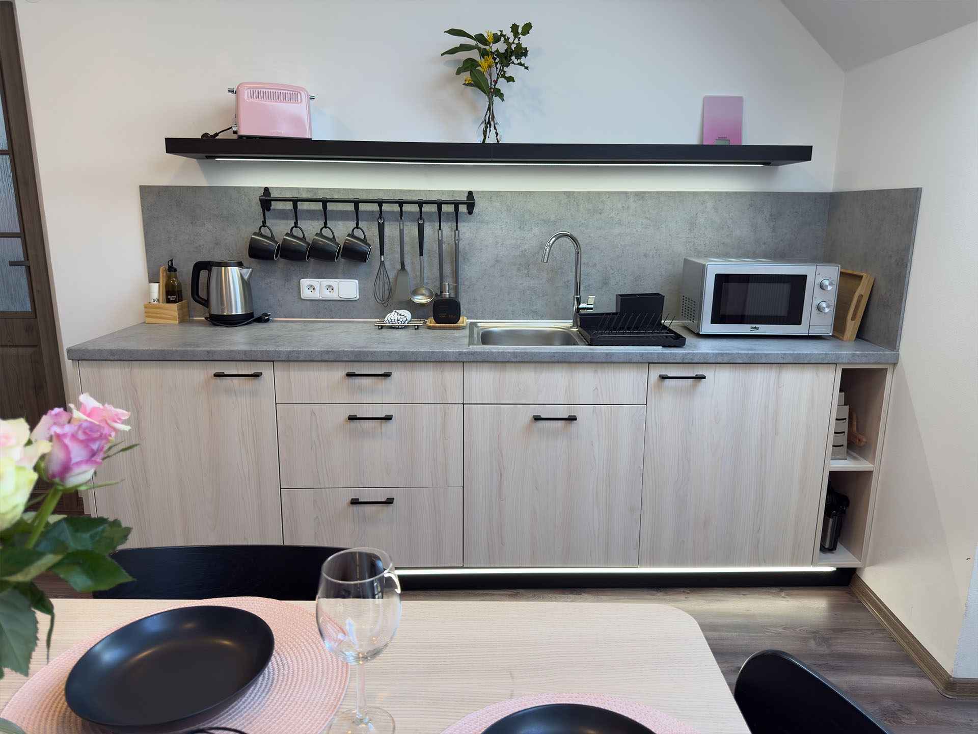 Kuchyňka je plně vybavená pro běžné vaření a stolování: